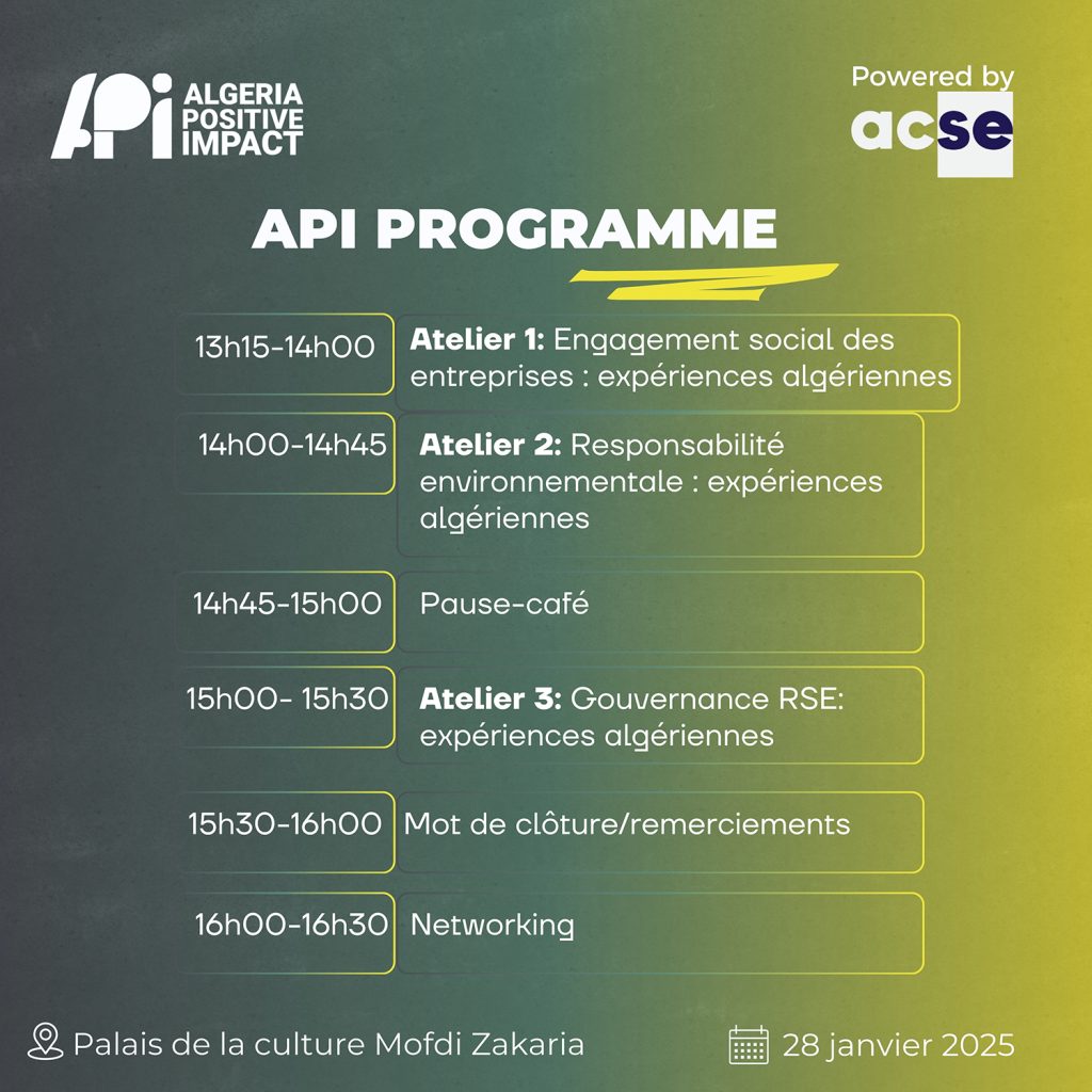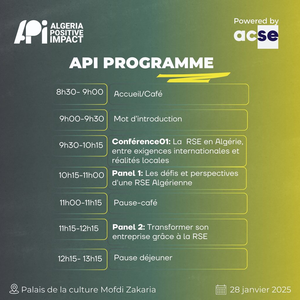Découvrez Algeria Positive Impact, un forum économique qui réunit des entreprises en Algérie pour sensibiliser aux bénéfices de la RSE, inspirer par des exemples concrets et encourager le partage de bonnes pratiques et de solutions durables.